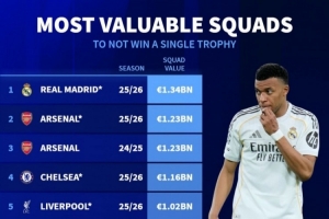 德转列无冠球队身价榜:若皇马、阿森纳本赛季无冠,将排名前两位