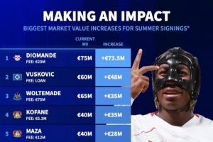 24直播网4月28日讯 德国转会市场列出了去年夏窗签约球员身价上涨排名,扬·迪奥曼德上涨7350万欧居首、武什科维奇上涨4800万欧次席。