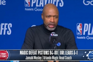 24直播网4月28日讯 NBA季后赛首轮G4,魔术94-88力克活塞,系列赛大比分3-1领先,魔术主帅莫斯利赛后接受了媒体采访,以下为完整版采访内容。