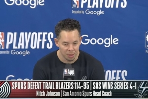 约翰逊:是的,我认为所有关于季后赛的讨论显然都是真实的。身体对抗、竞争强度,每一个回合都是在为了生存而战。我认为当你每天都和同一支球队交手时,那些花哨的策略就不那么重要了。我觉得在这个系列赛的5场比赛中,有很多方面我本可以给球员们提供更多的帮助。但整个过程非常有趣,他们做得非常棒,我对他们在面对一支一整年都充满竞争力和对抗性的球队时所展现出的比赛回应感到非常满意。不仅仅是季后赛,他们在常规赛也是如此。