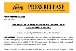 24直播网5月1日讯 洛杉矶湖人宣布将球队下属G联盟球队迁至科切拉谷 (Coachella Valley),科切拉谷位于加州的大棕榈泉地区(Greater Palm Springs)。新赛季主场也将移师棕榈沙漠(Palm Desert)的Acrisure体育馆。